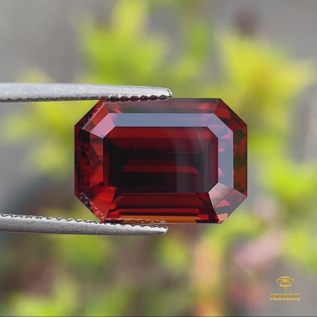 A spectacular emerald-cut red zircon from Tanzania, radiating a vivid fiery hue with exceptional brilliance and clarity.