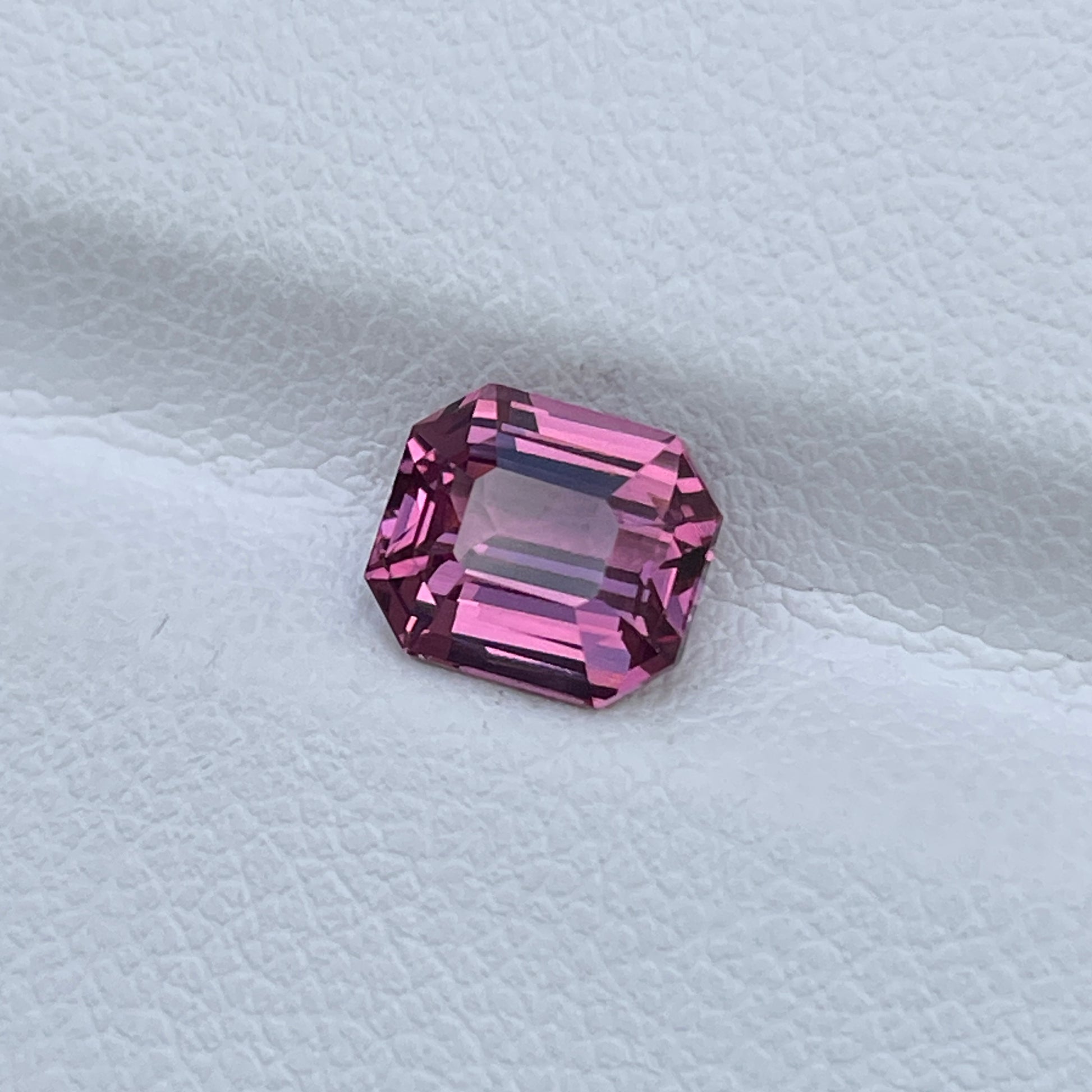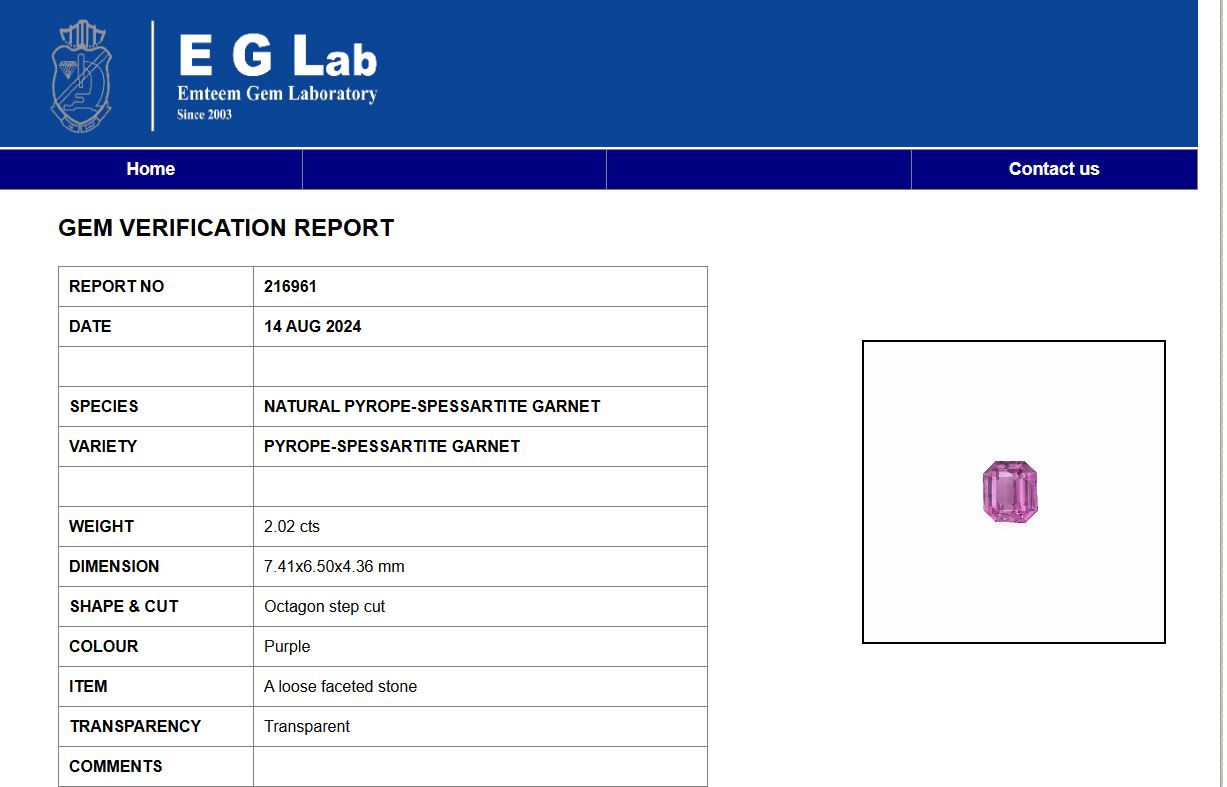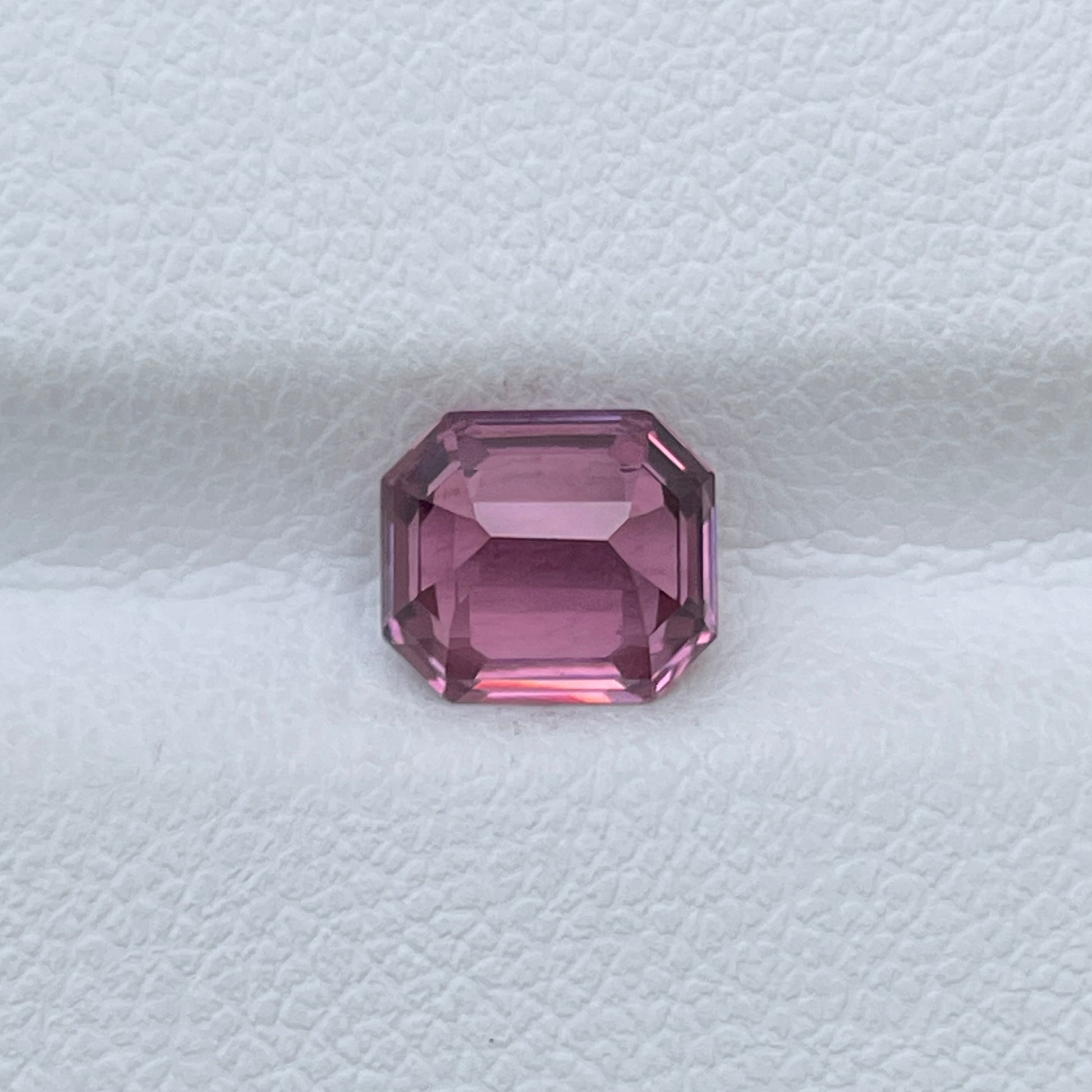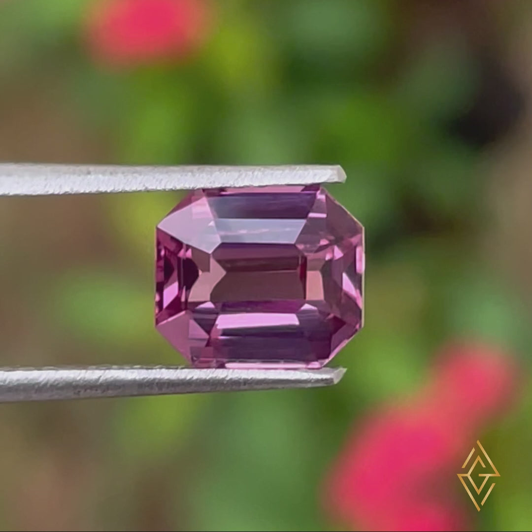 A captivating Emerald-cut Spessartite Garnet, boasting a rich purple hue with excellent clarity and a sparkling luster. Its sharp Emerald cut enhances the gem's natural brilliance, making it a striking choice for high-end jewelry or a collector's piece.