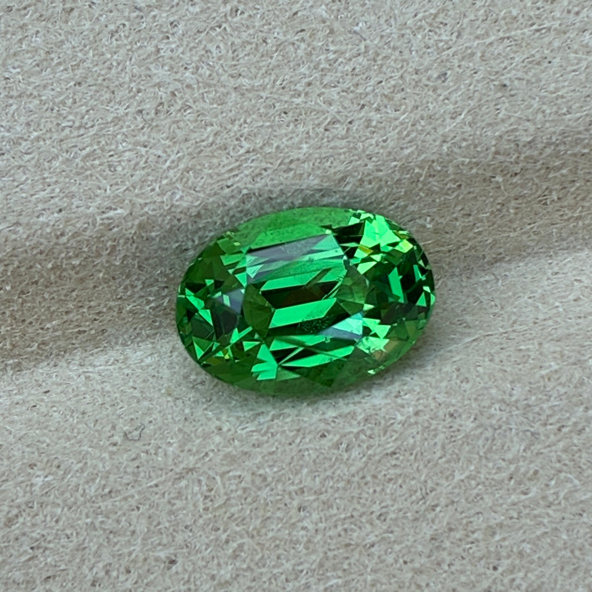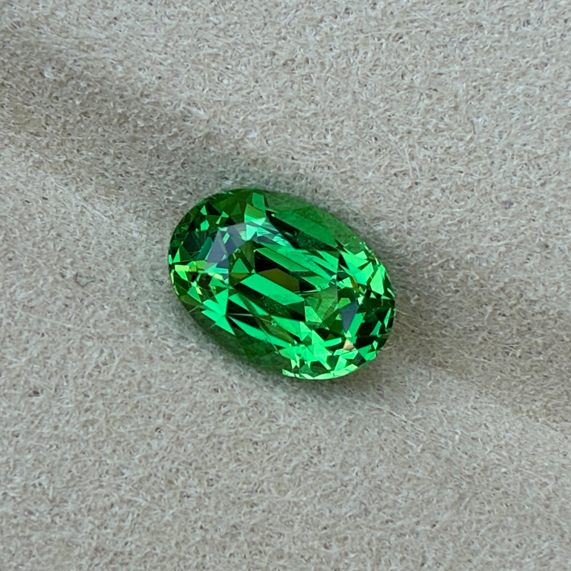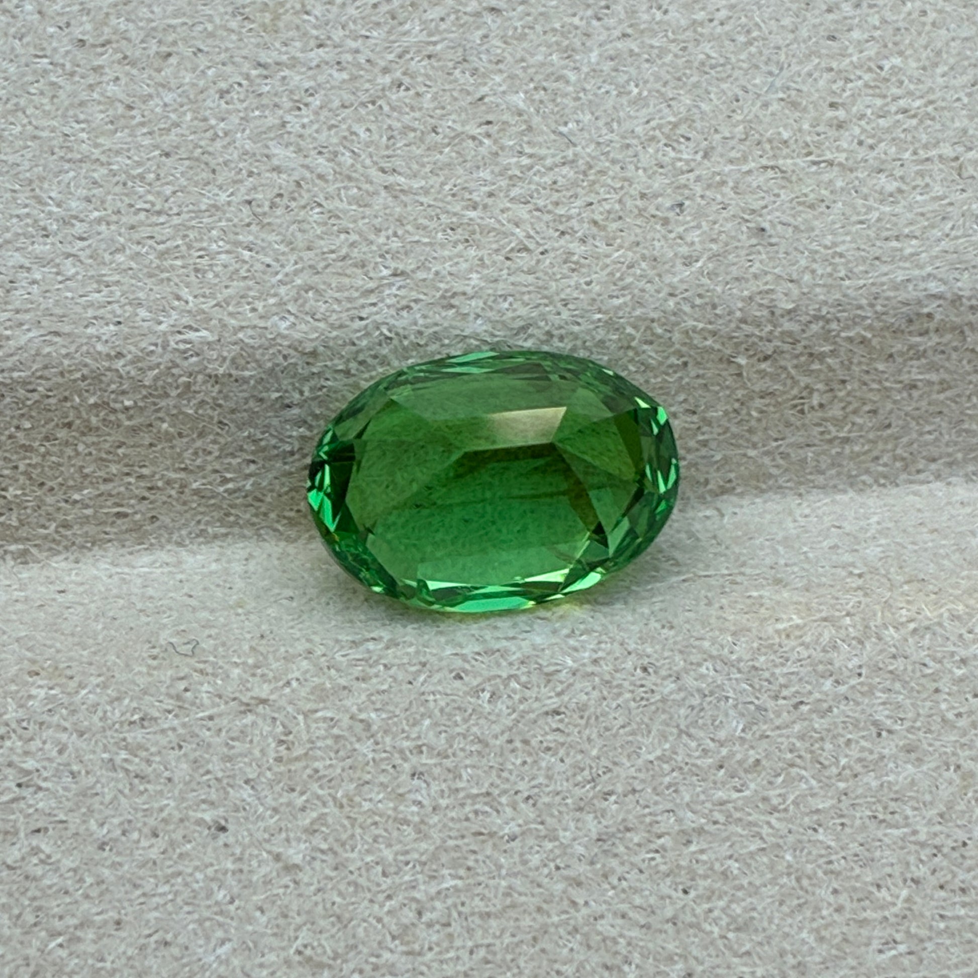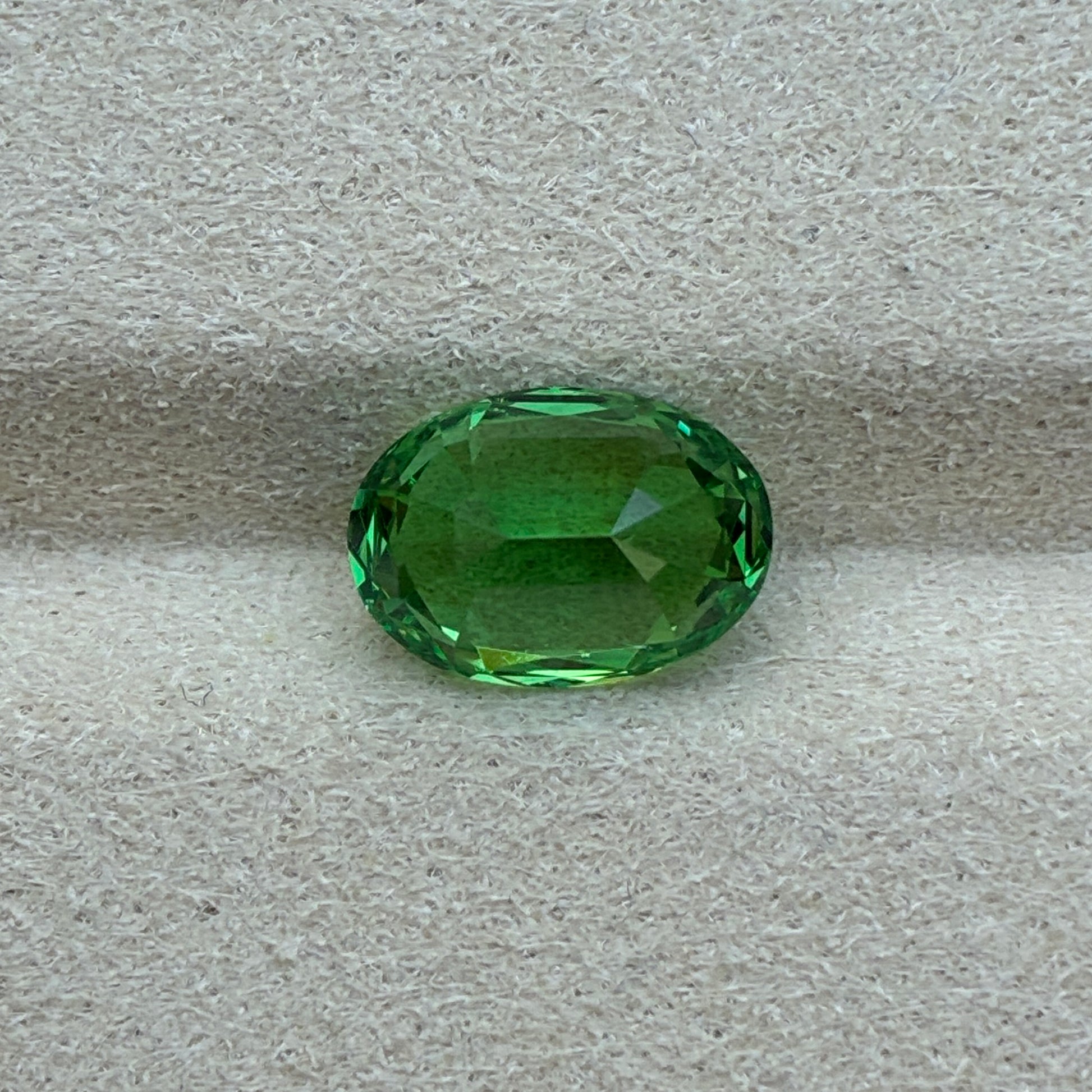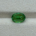 A beautiful oval-cut green Tsavorite from Vietnam, showcasing a vibrant emerald-green hue with sparkling brilliance and slight inclusions.