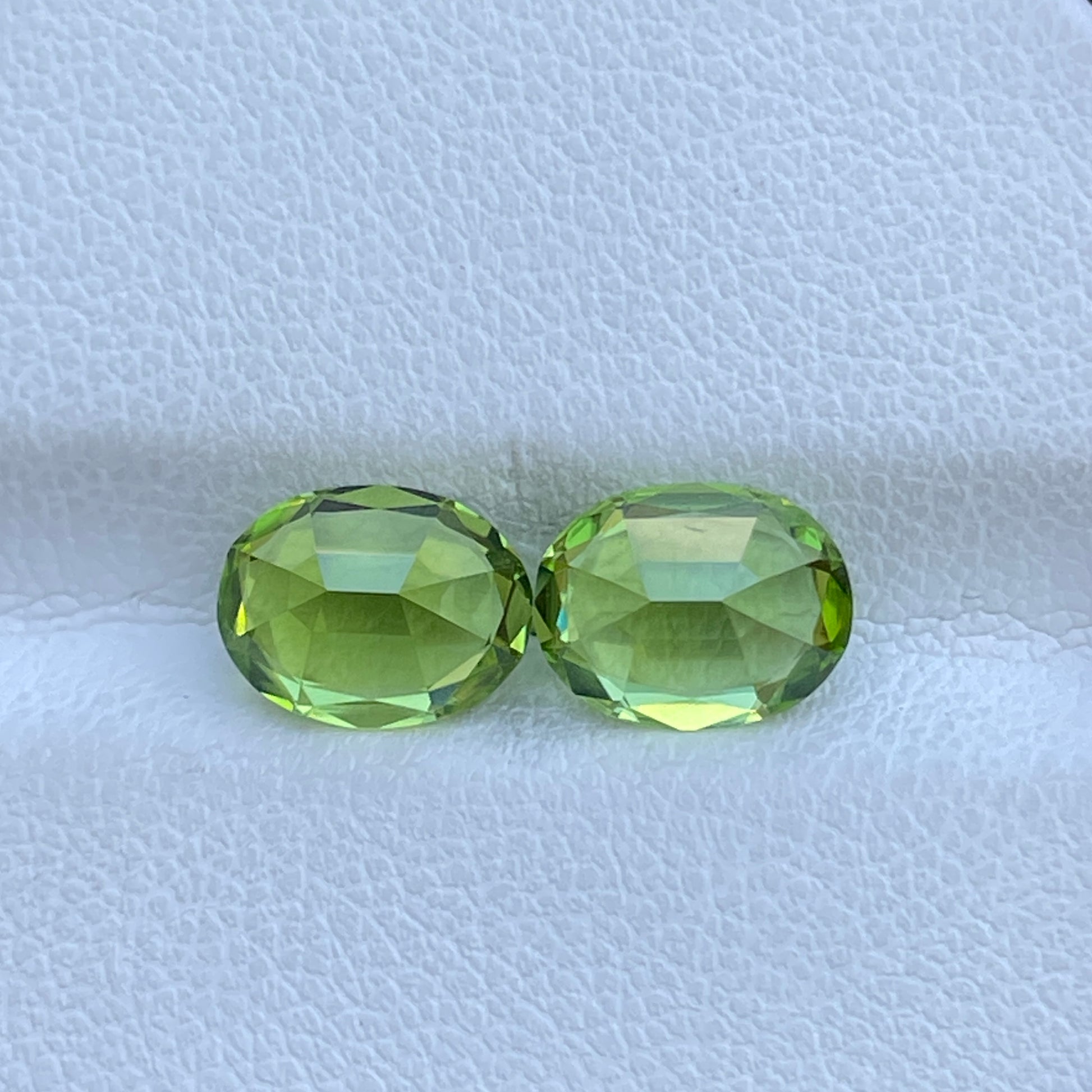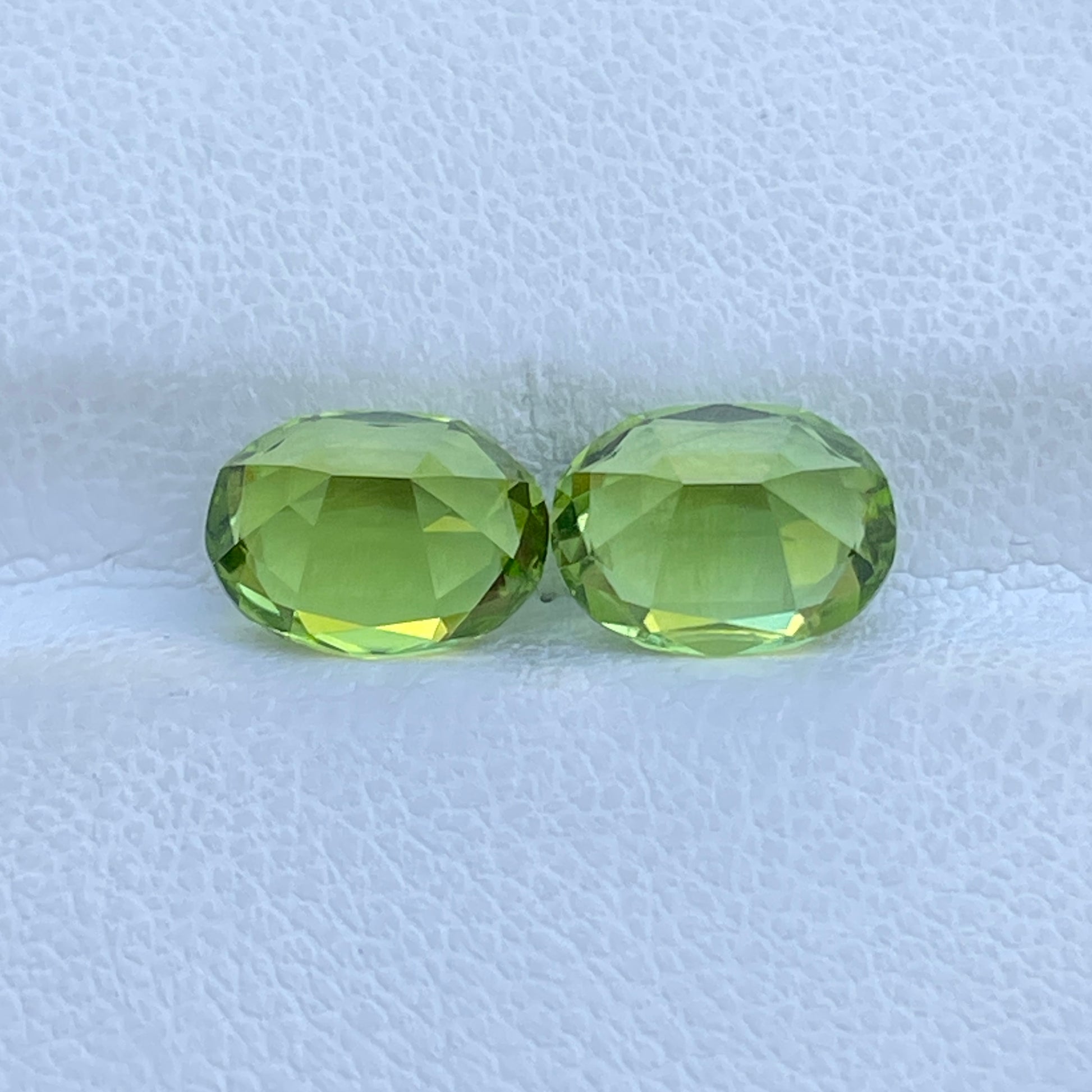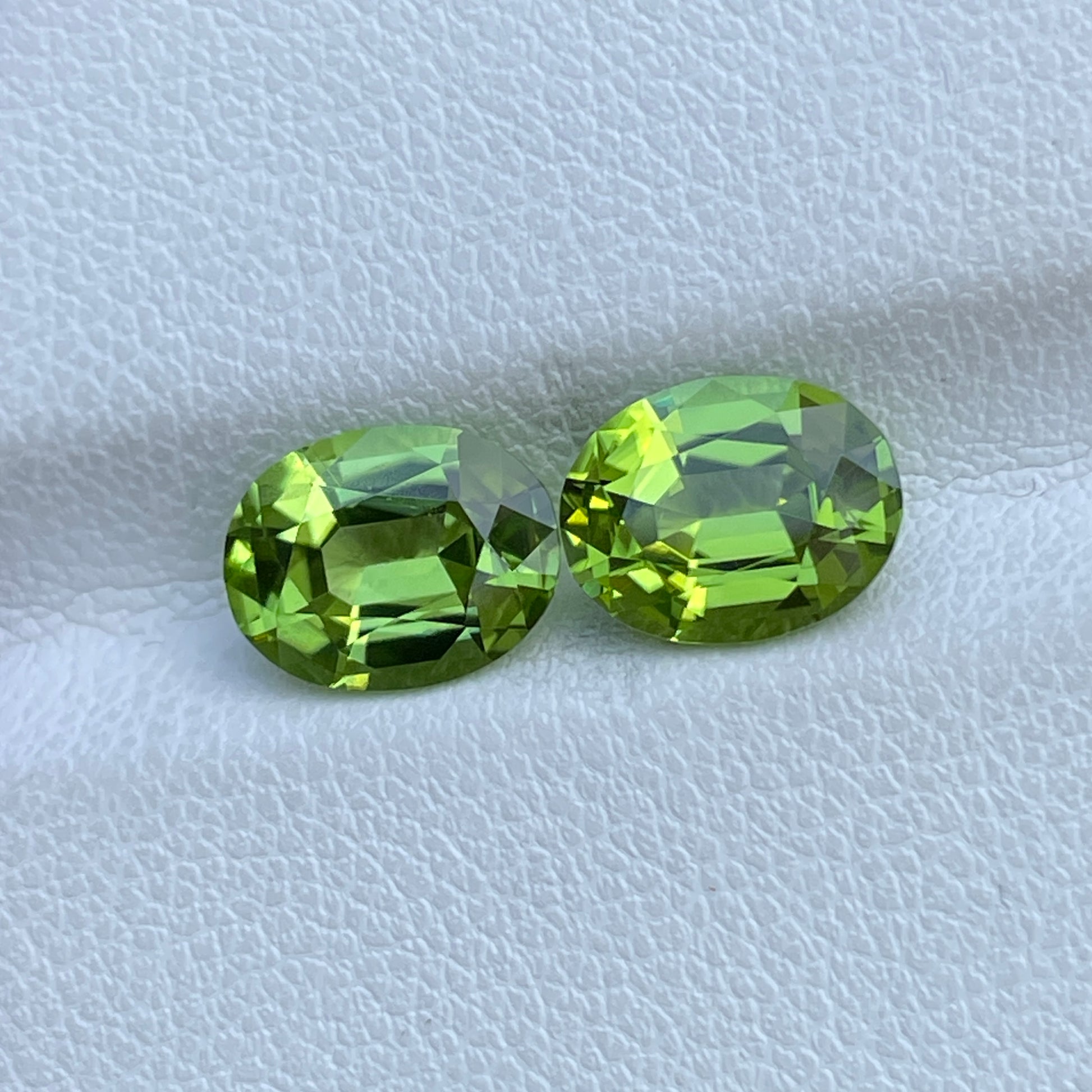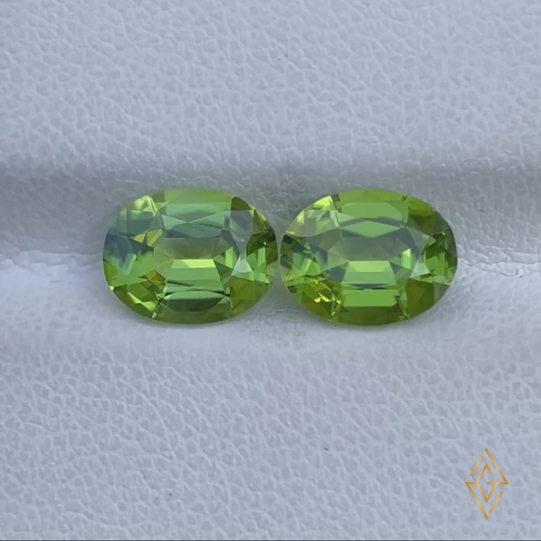 A vibrant matched pair of oval-cut Peridots, radiating a rich green hue with sparkling luster and excellent clarity—perfectly suited for elegant earrings or custom fine jewelry.