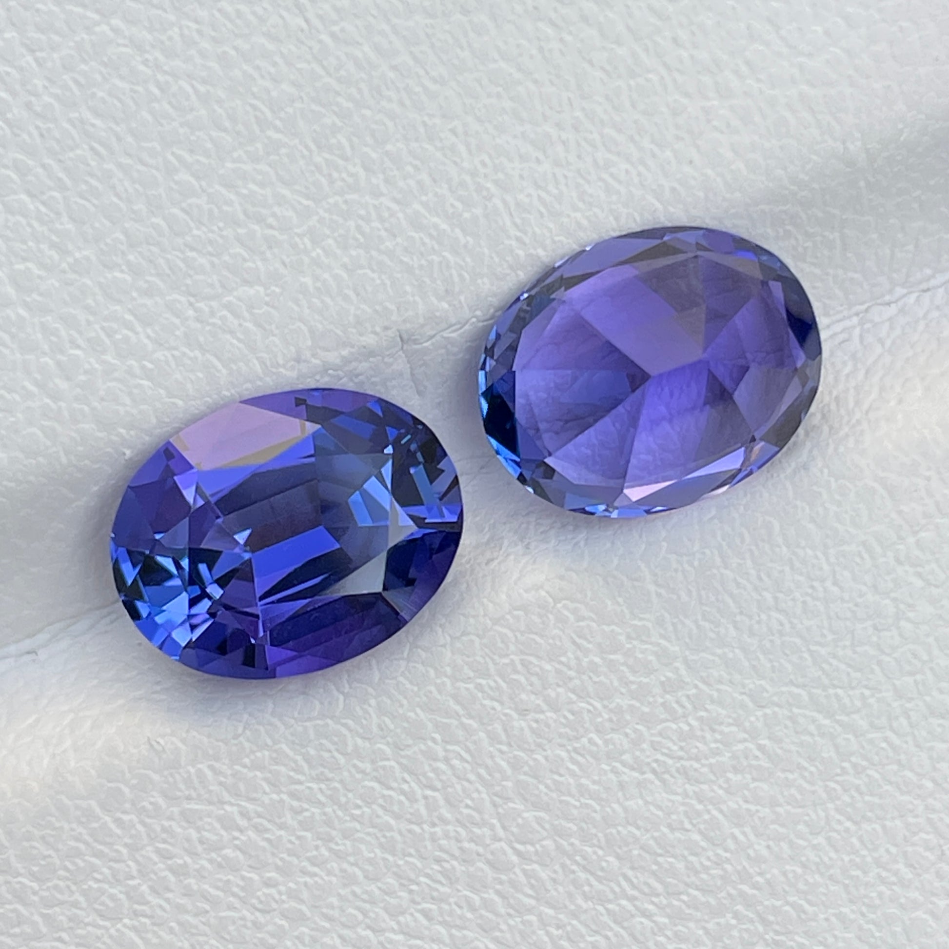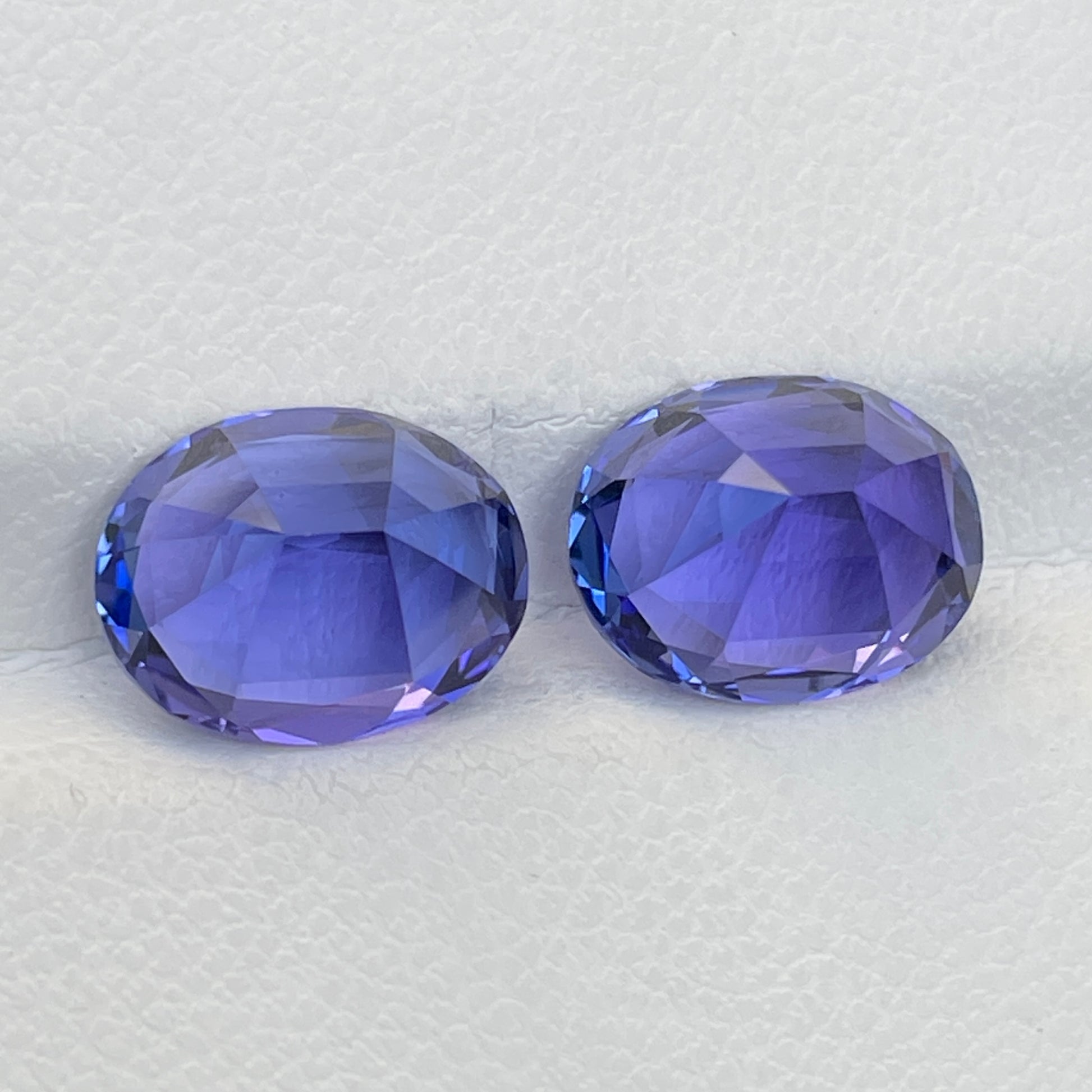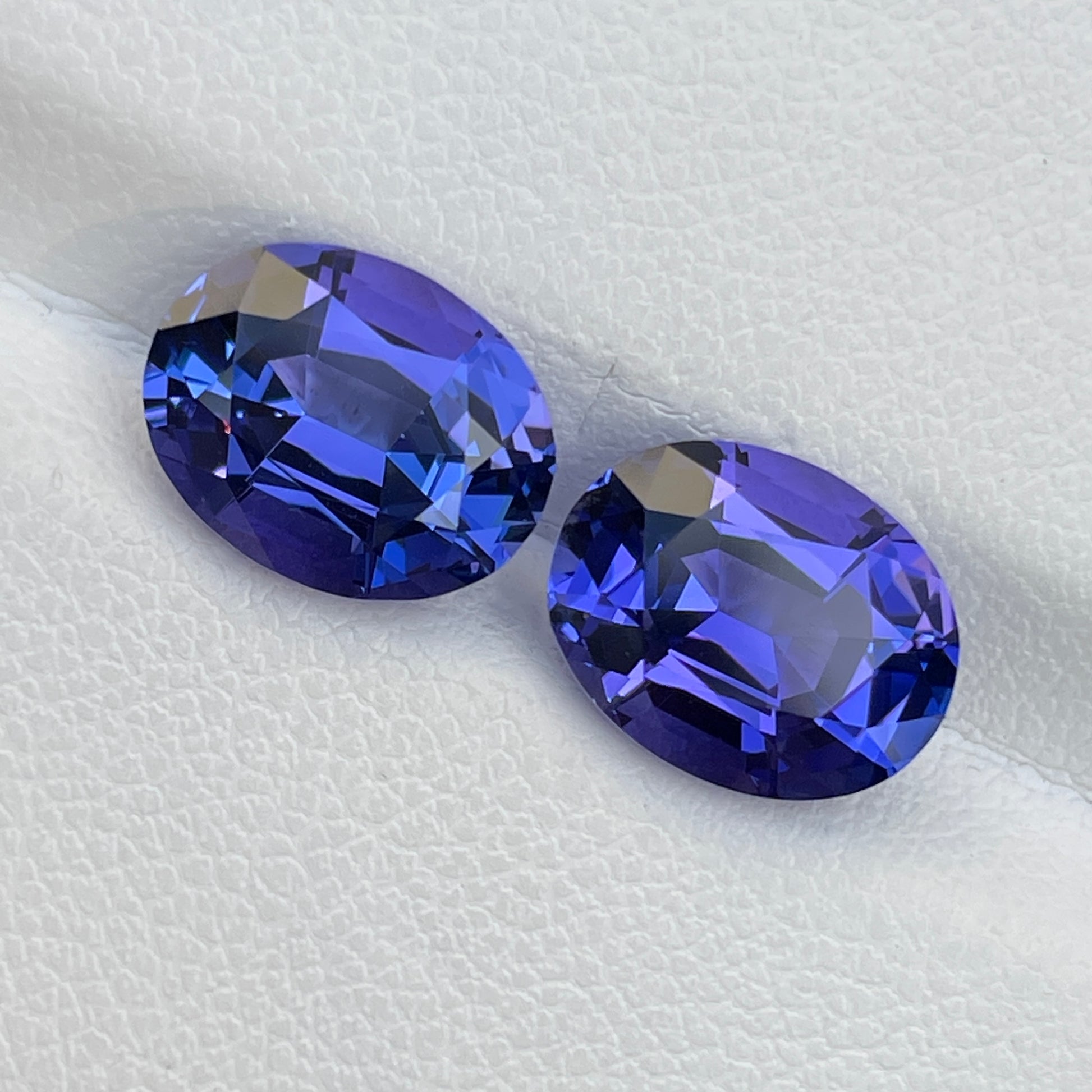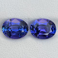A stunning pair of oval-cut Tanzanites from Tanzania, radiating a rich violet hue with sparkling brilliance and exceptional clarity.