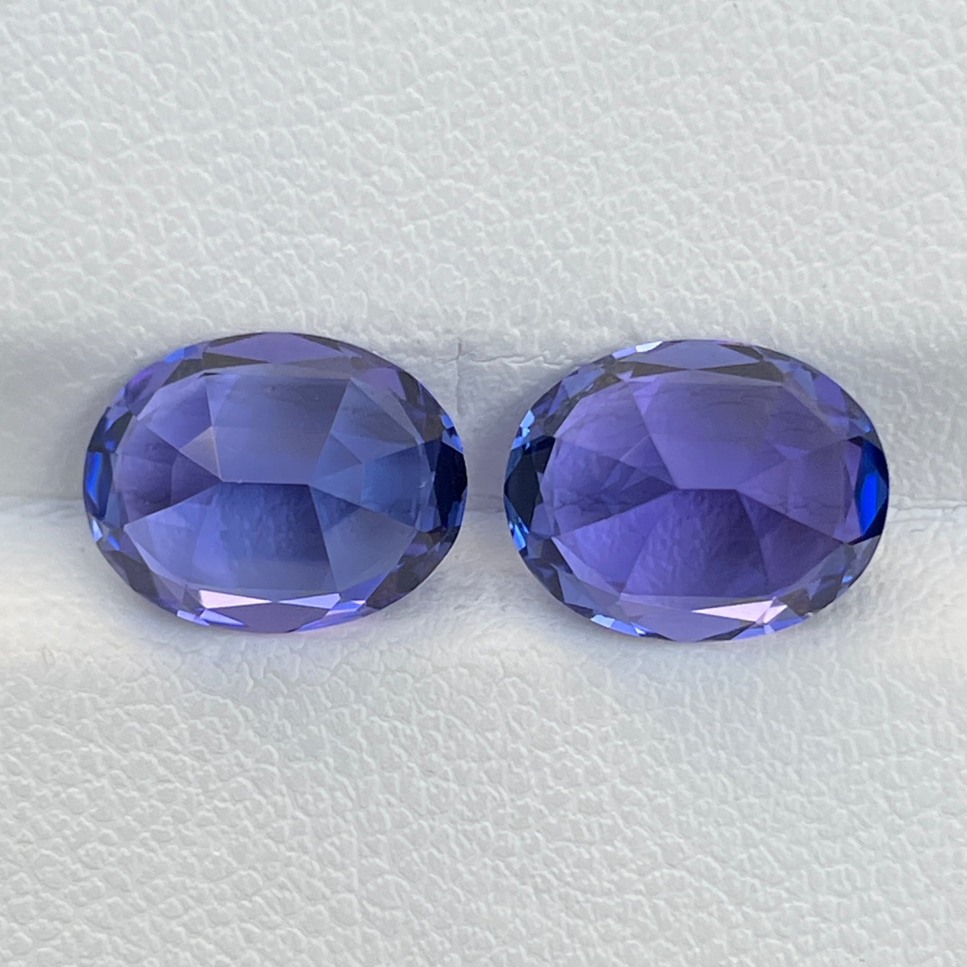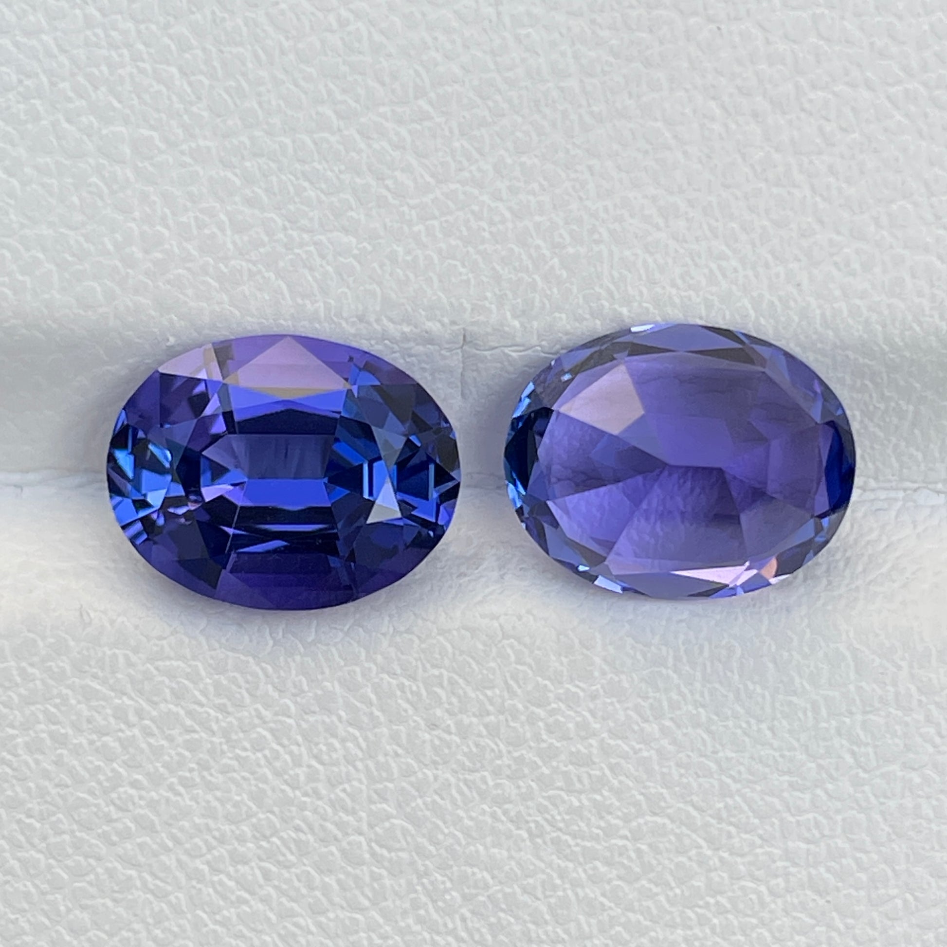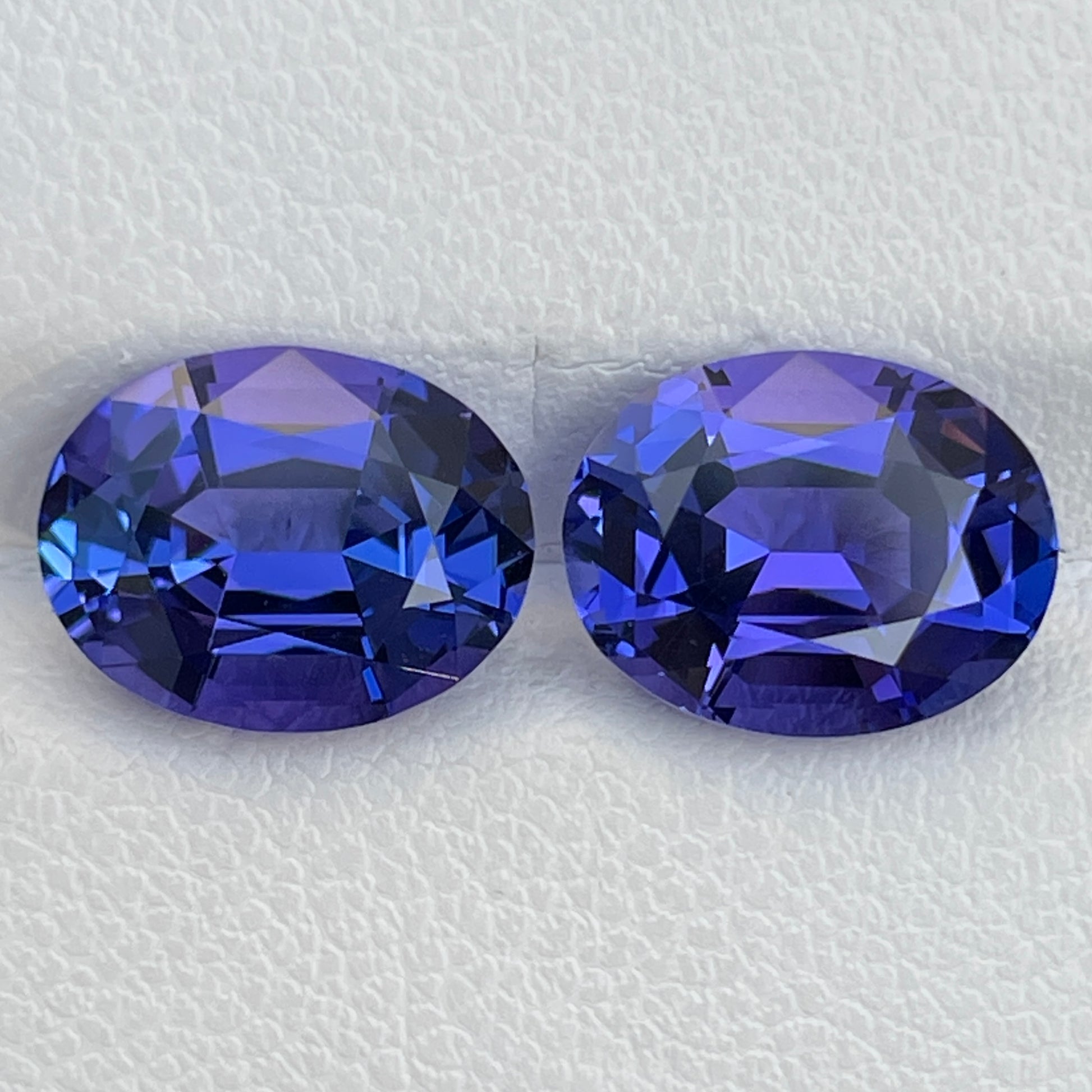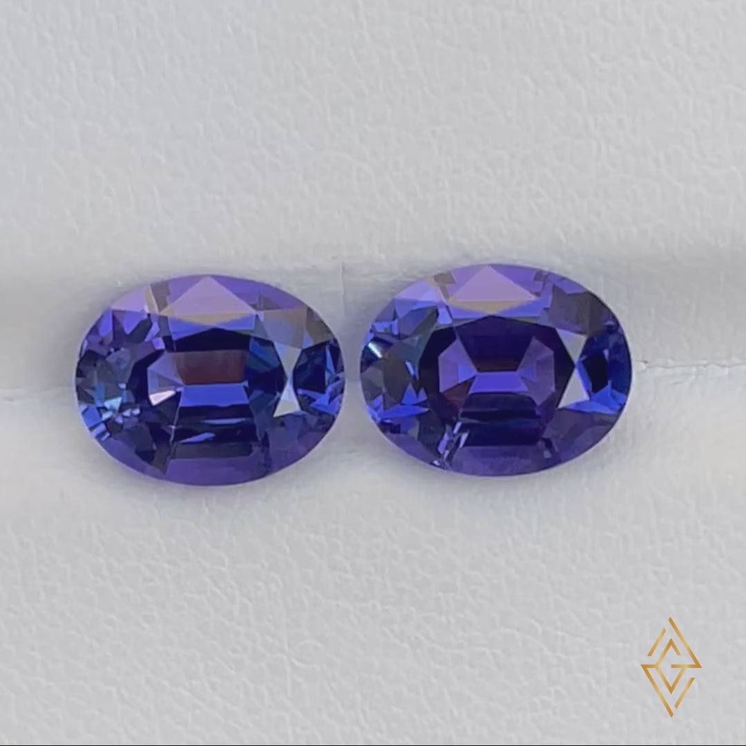 A stunning pair of oval-cut Tanzanites from Tanzania, radiating a rich violet hue with sparkling brilliance and exceptional clarity.