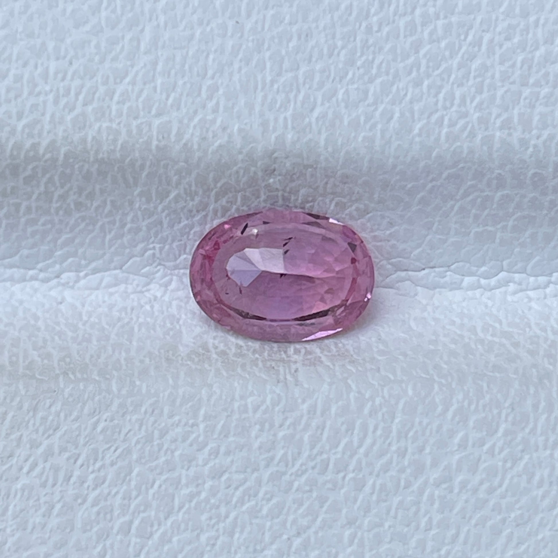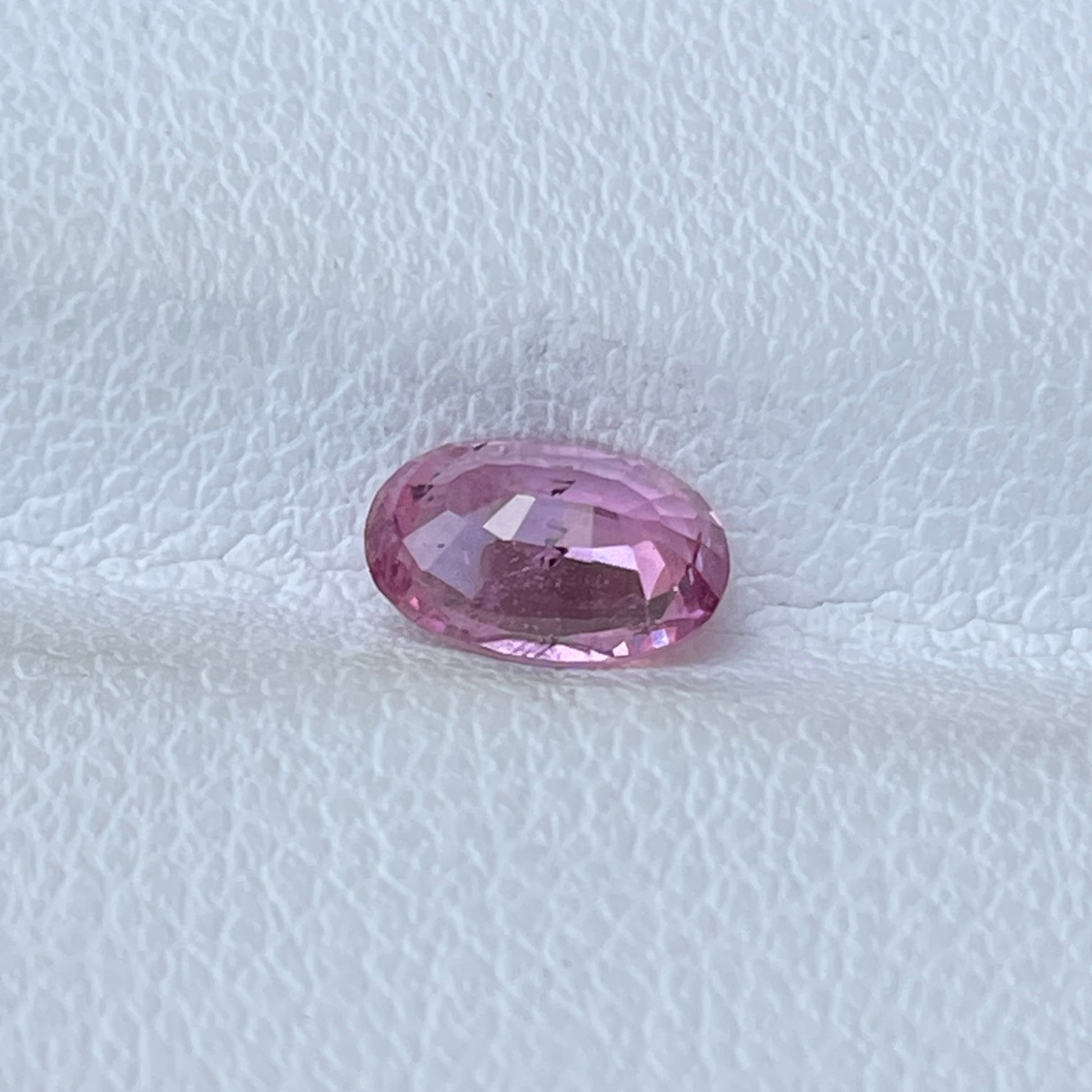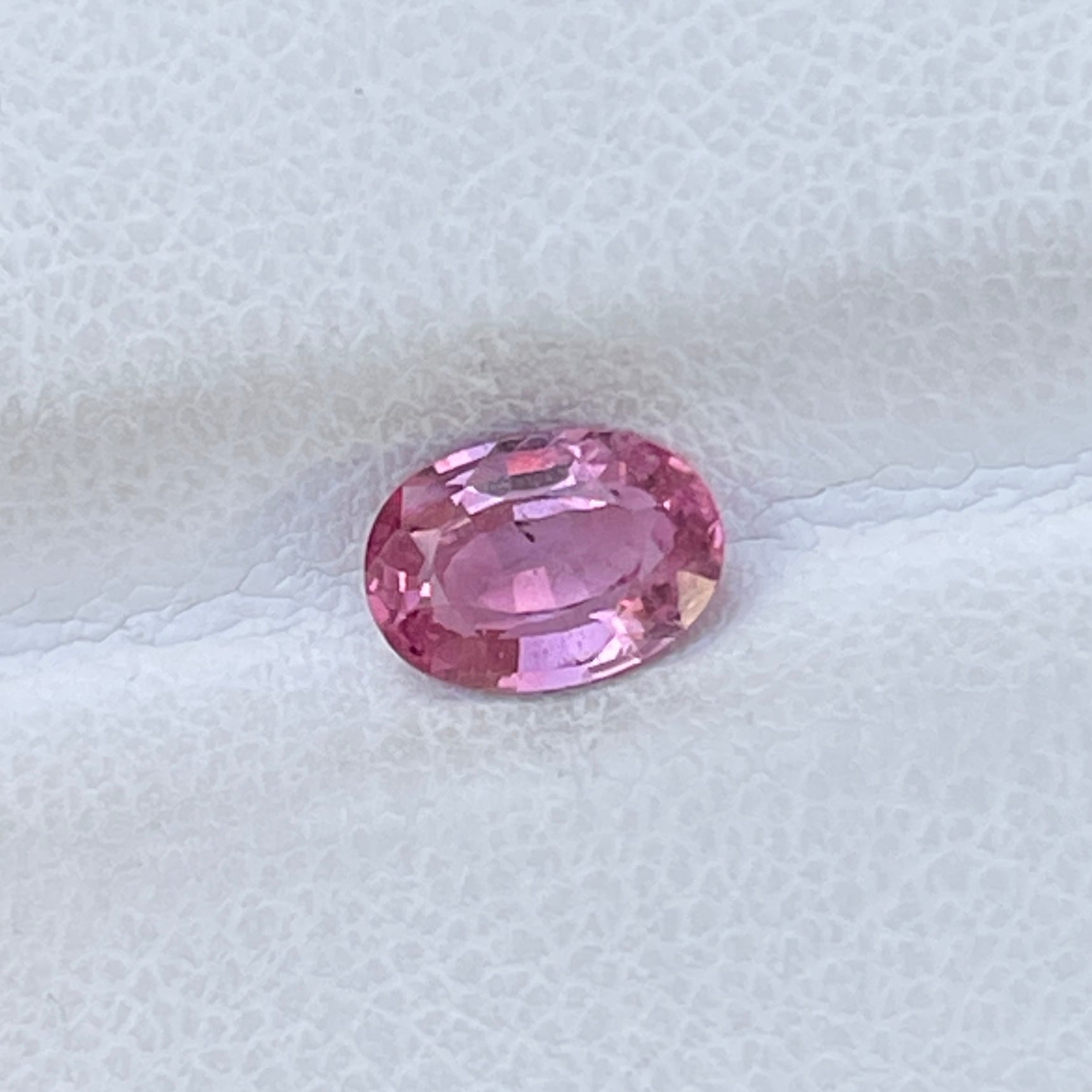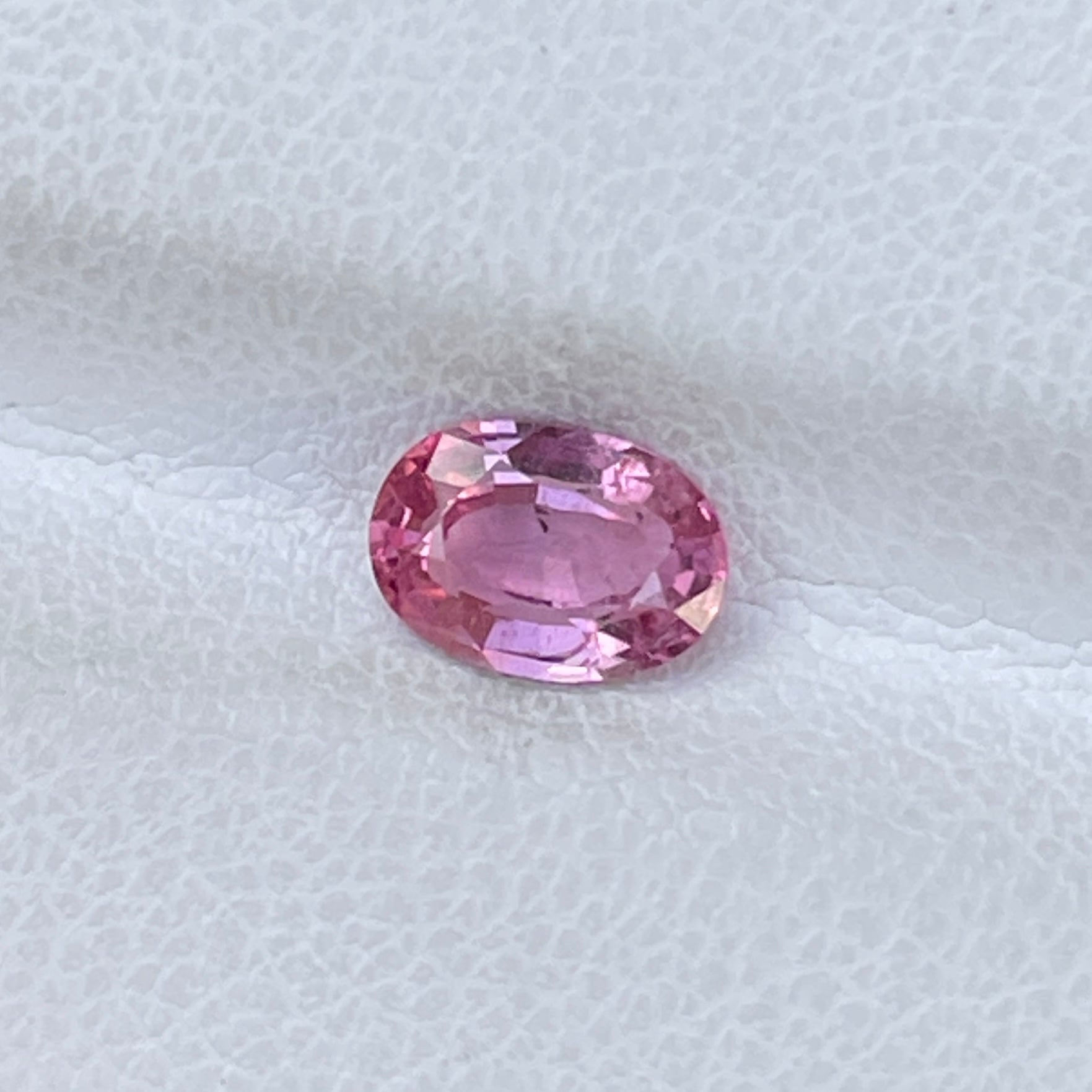 A stunning oval-shaped Padparadscha Sapphire with a delicate orangish-pink color, exhibiting a brilliant sparkle.