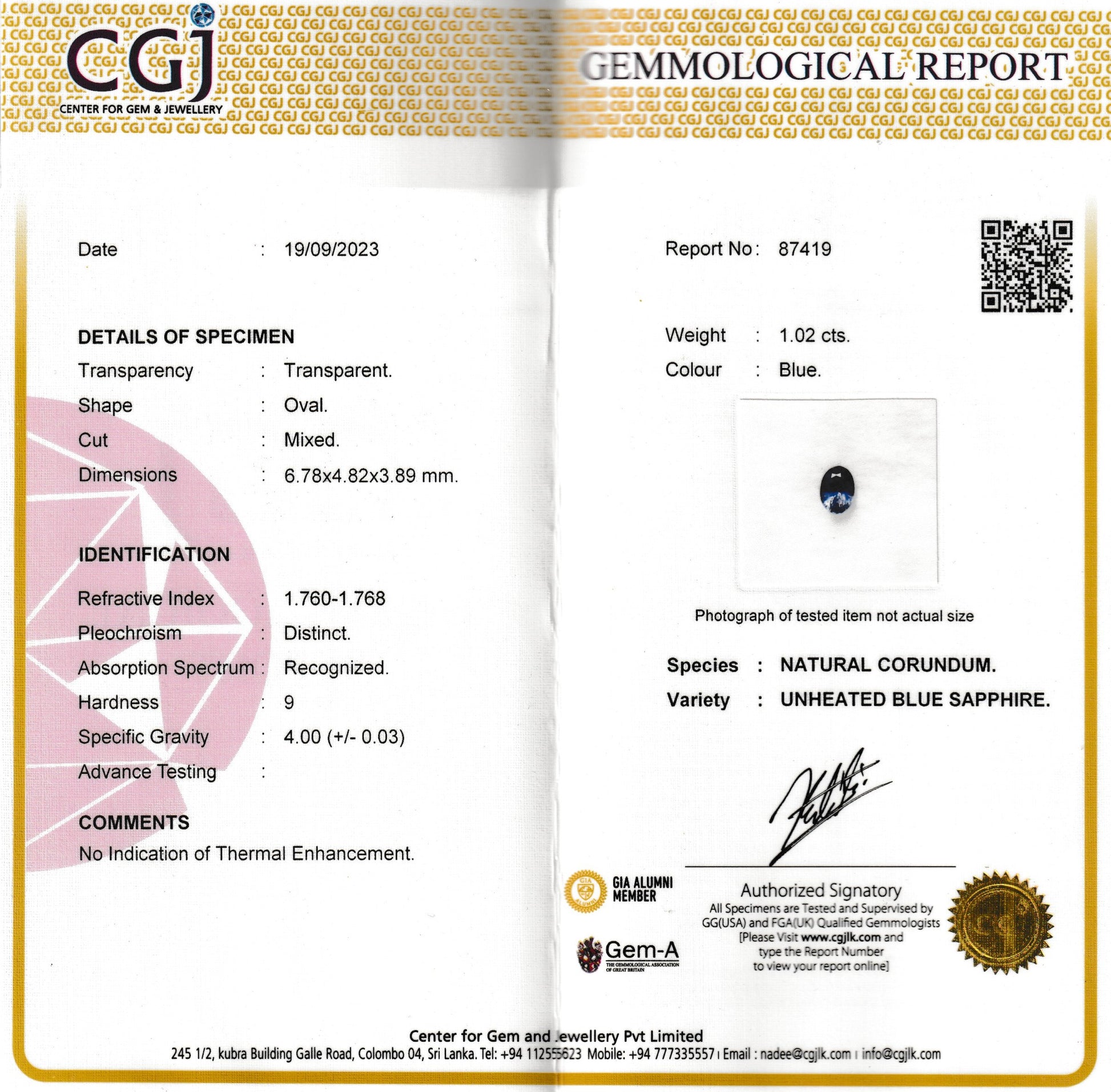 CERTIFIED Unheated Natural Ceylon Blue Sapphire 1.02 Ct Oval Loose Gemstone
