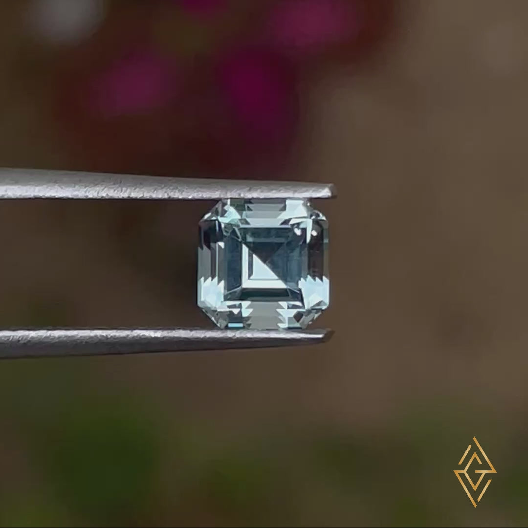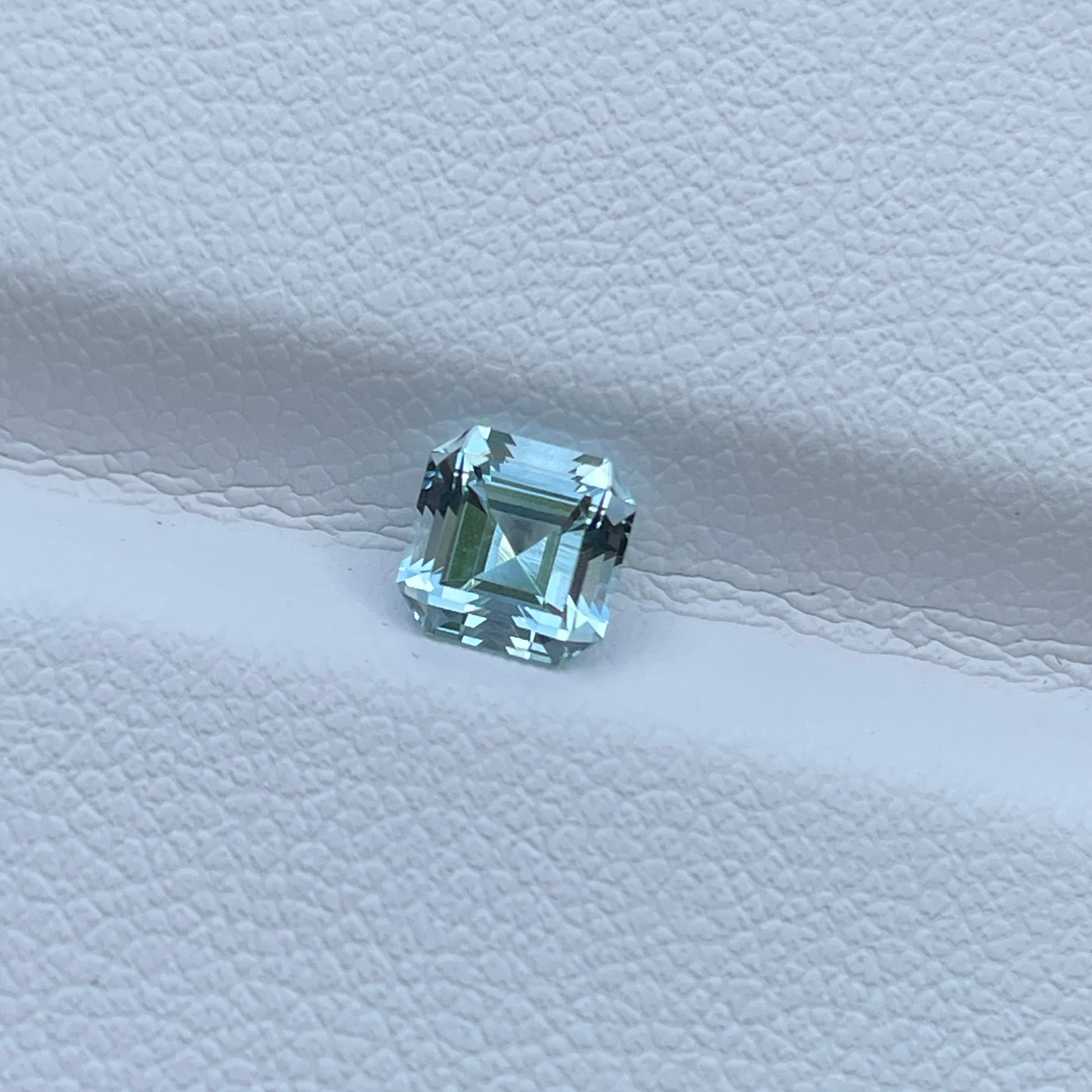 A rare Asscher-cut Aquamarine, showcasing a refined blue hue with exceptional clarity and brilliant luster—perfect for a delicate yet sophisticated jewelry design.
