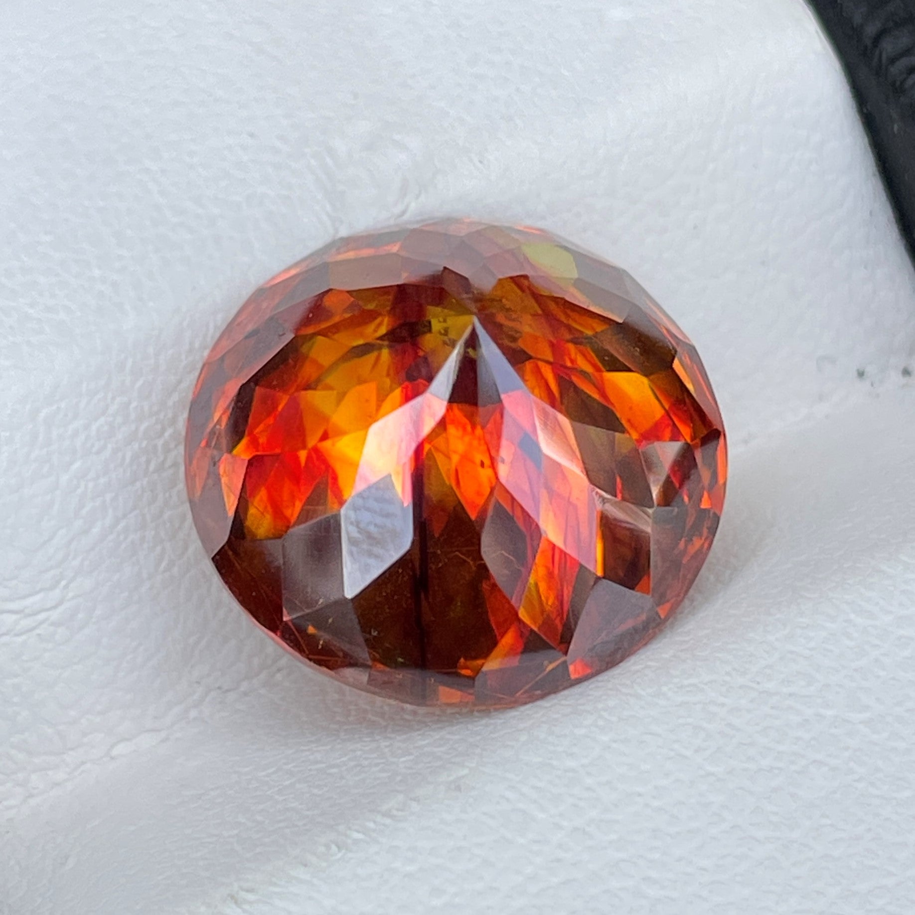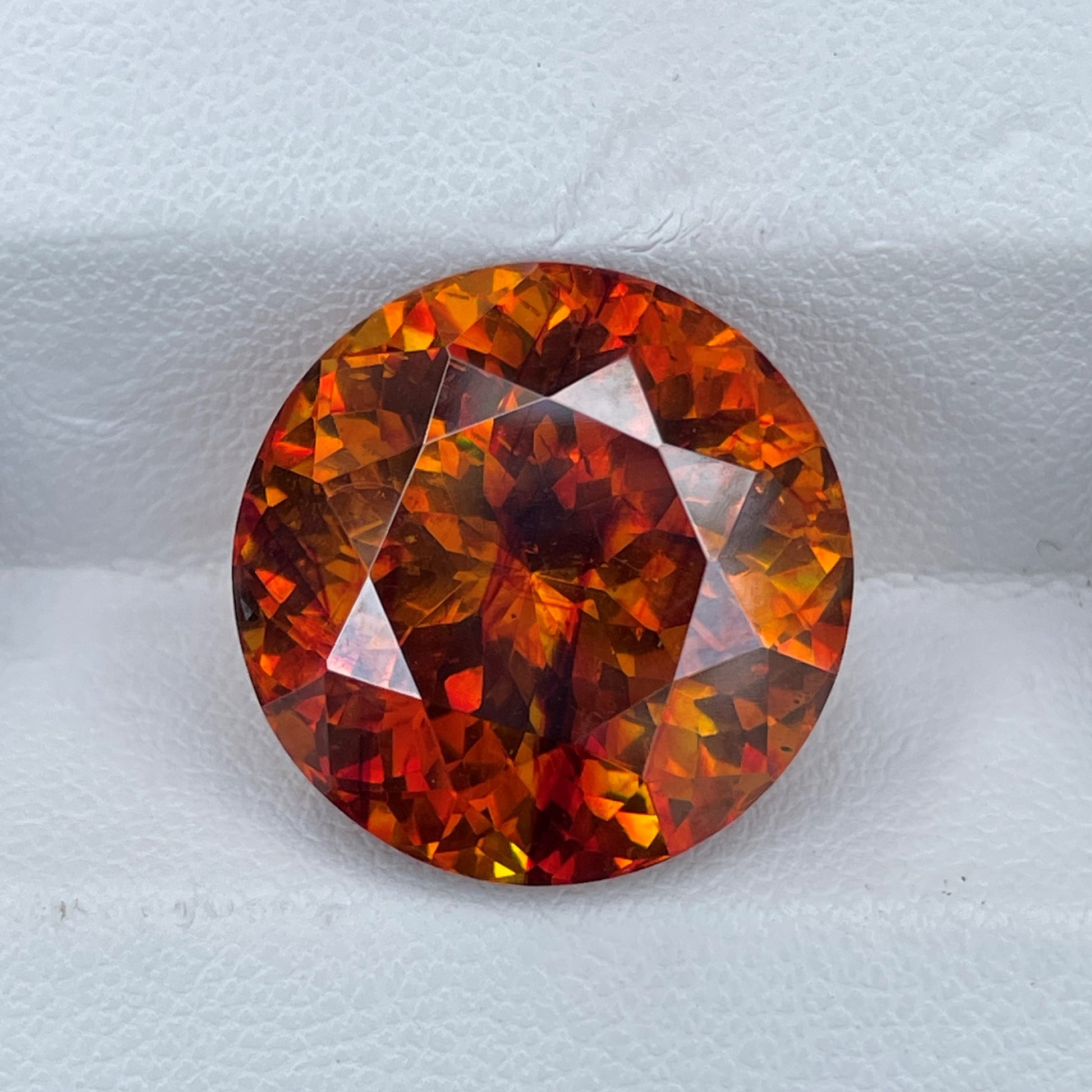 A magnificent round-cut Orange Sphalerite displaying an intense fiery hue and dazzling brilliance. Its vibrant color and sparkling luster make it a striking centerpiece for any collection or custom jewelry creation.