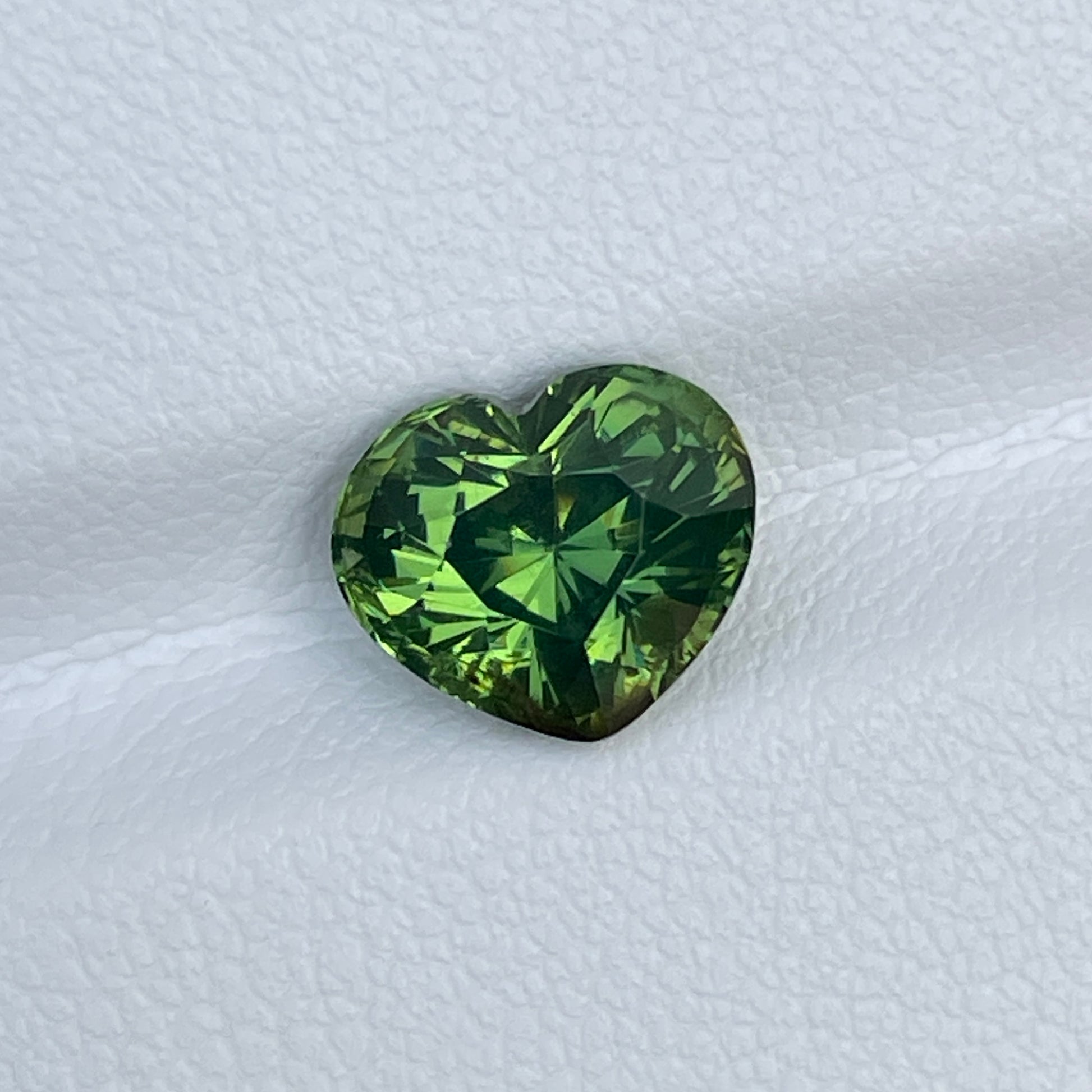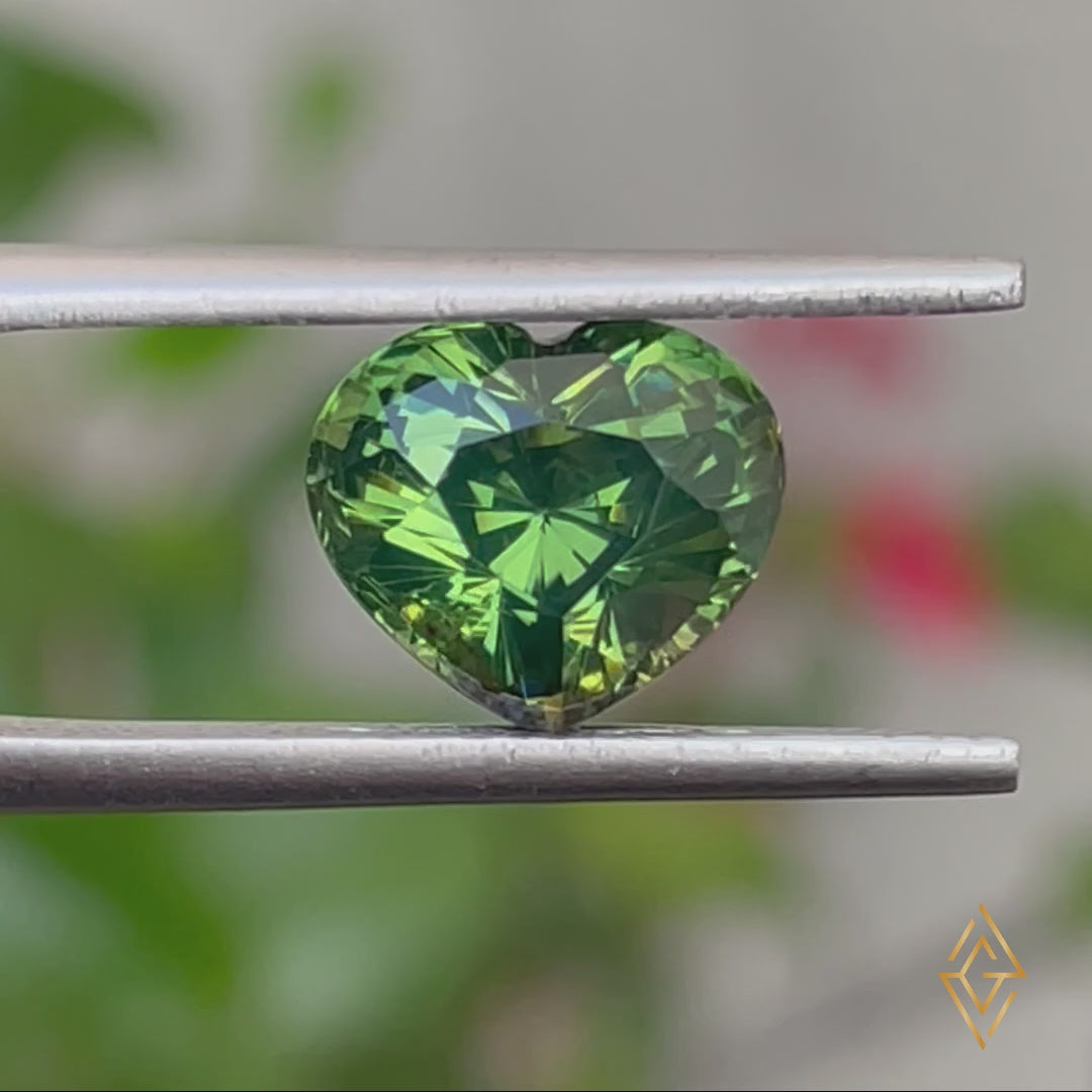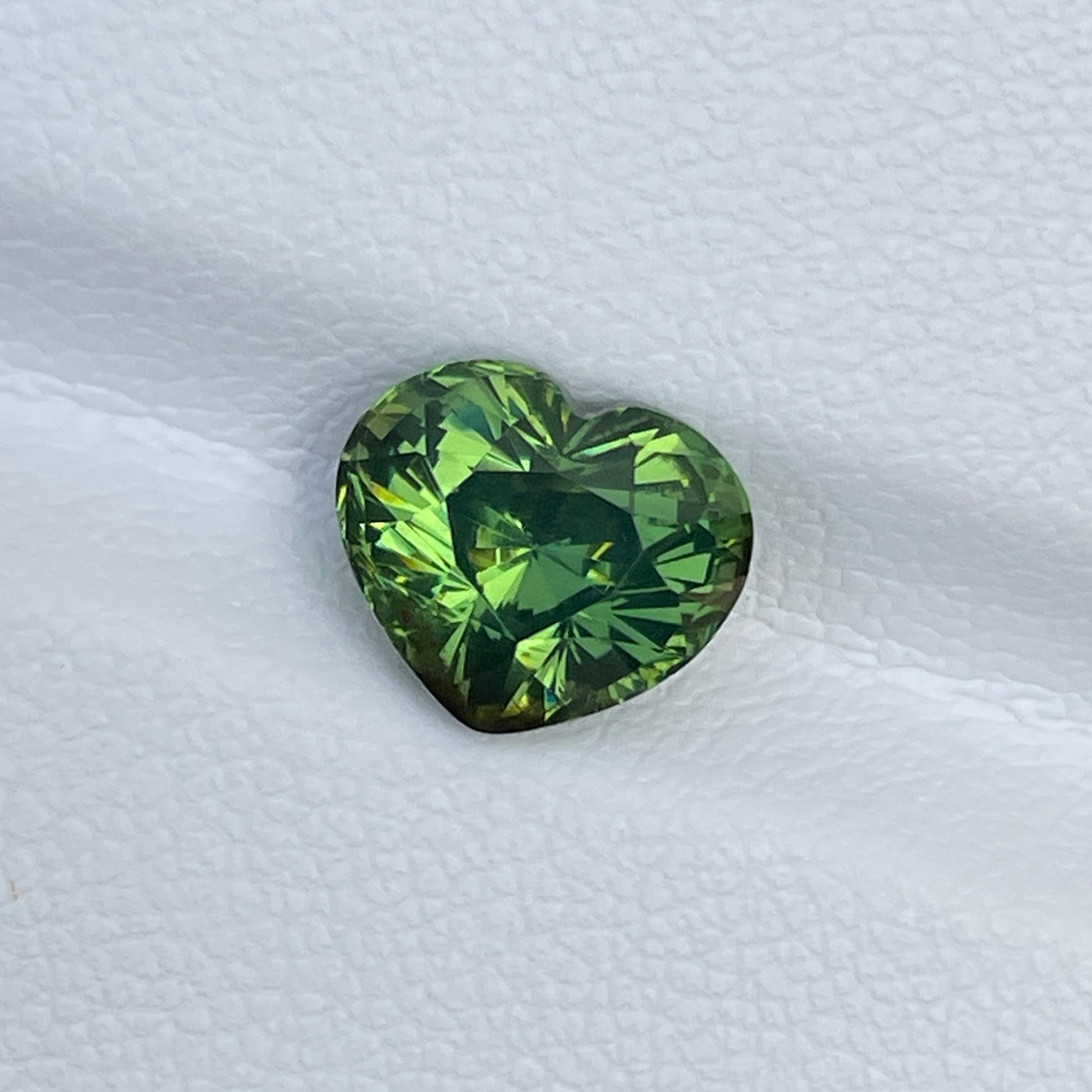A stunning heart-shaped Green Zircon showcasing a vivid green hue and sparkling brilliance. With excellent VS clarity and natural, untreated beauty, this gem radiates freshness and charm. Its vibrant color and lively luster make it a captivating choice for elegant jewelry or collectors seeking something truly unique.