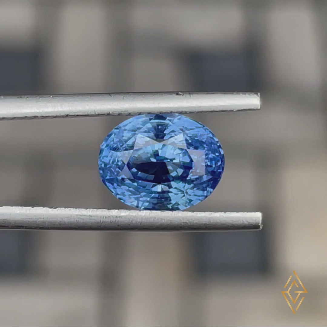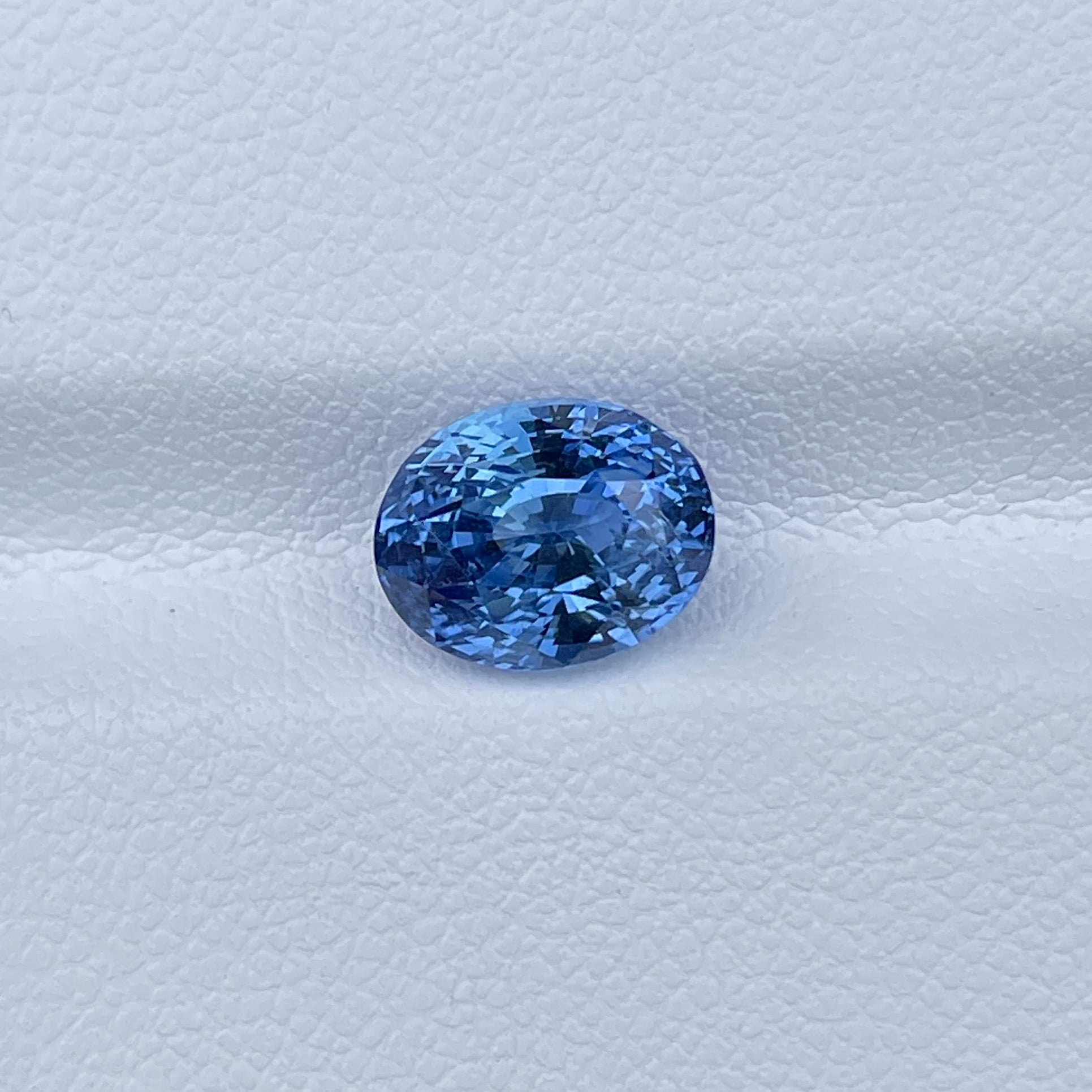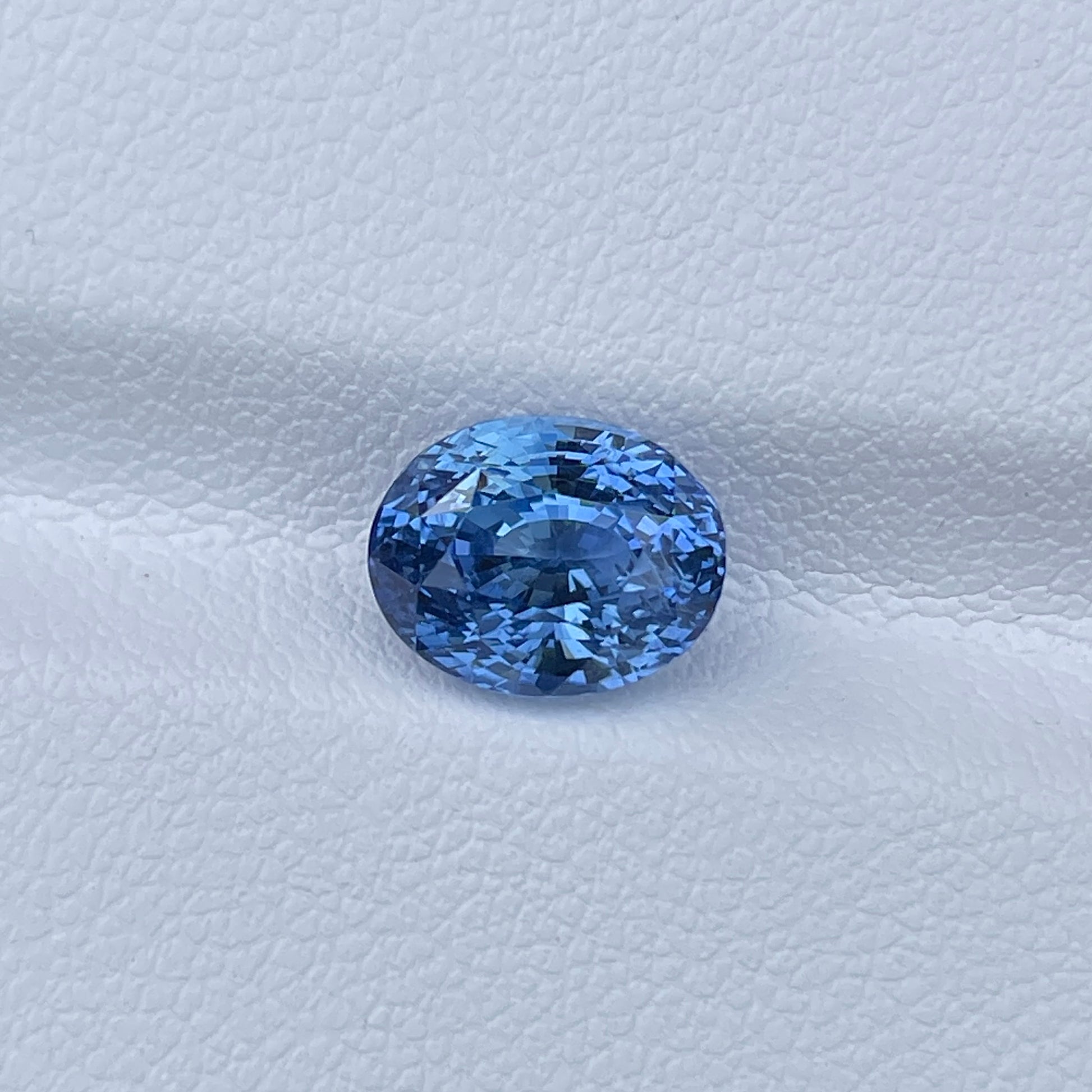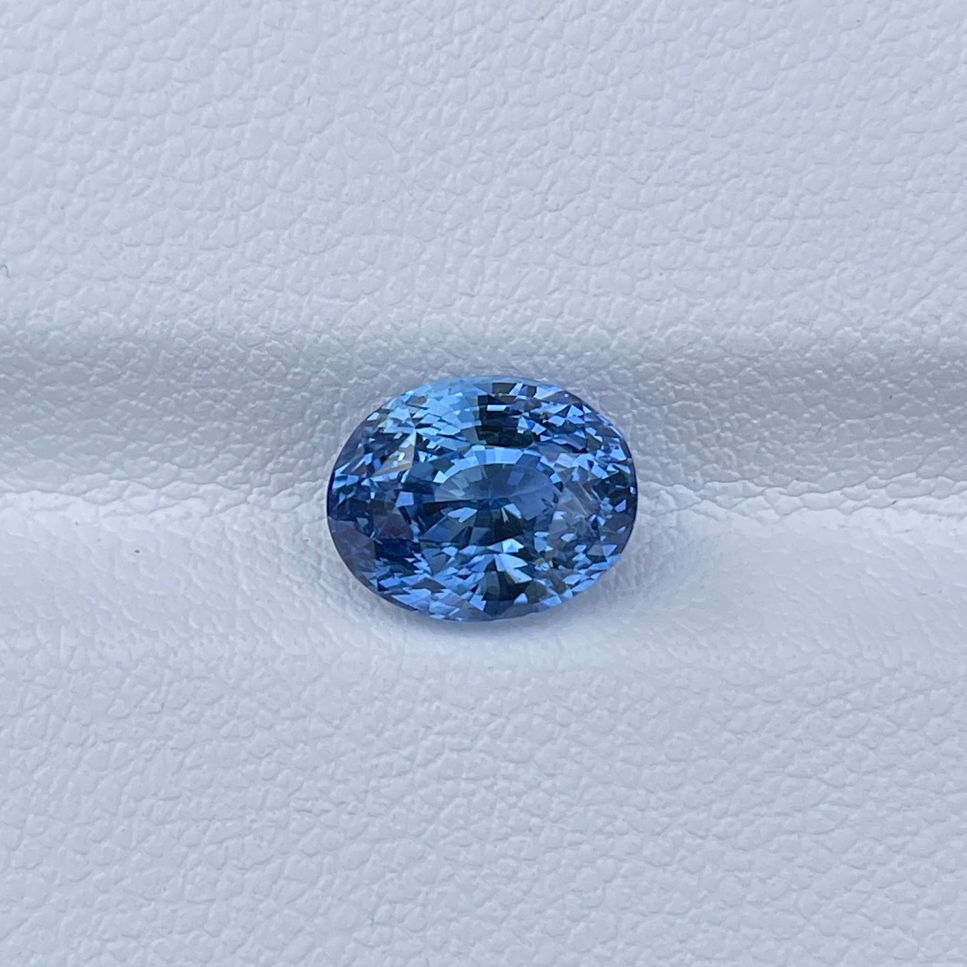 A brilliant oval-cut blue sapphire from Sri Lanka, featuring a vivid deep-blue hue with sparkling brilliance and eye-clean clarity.