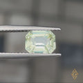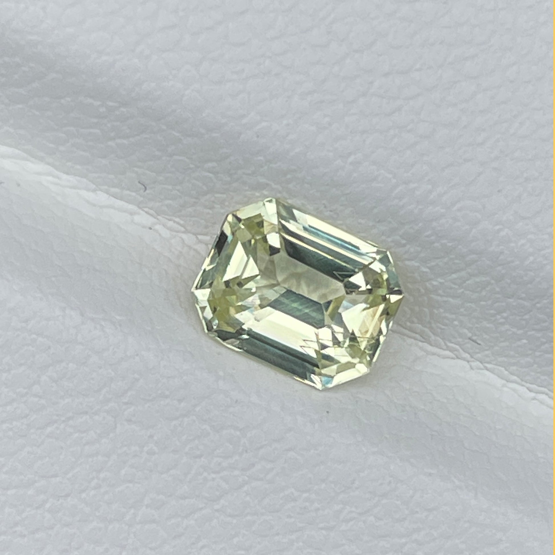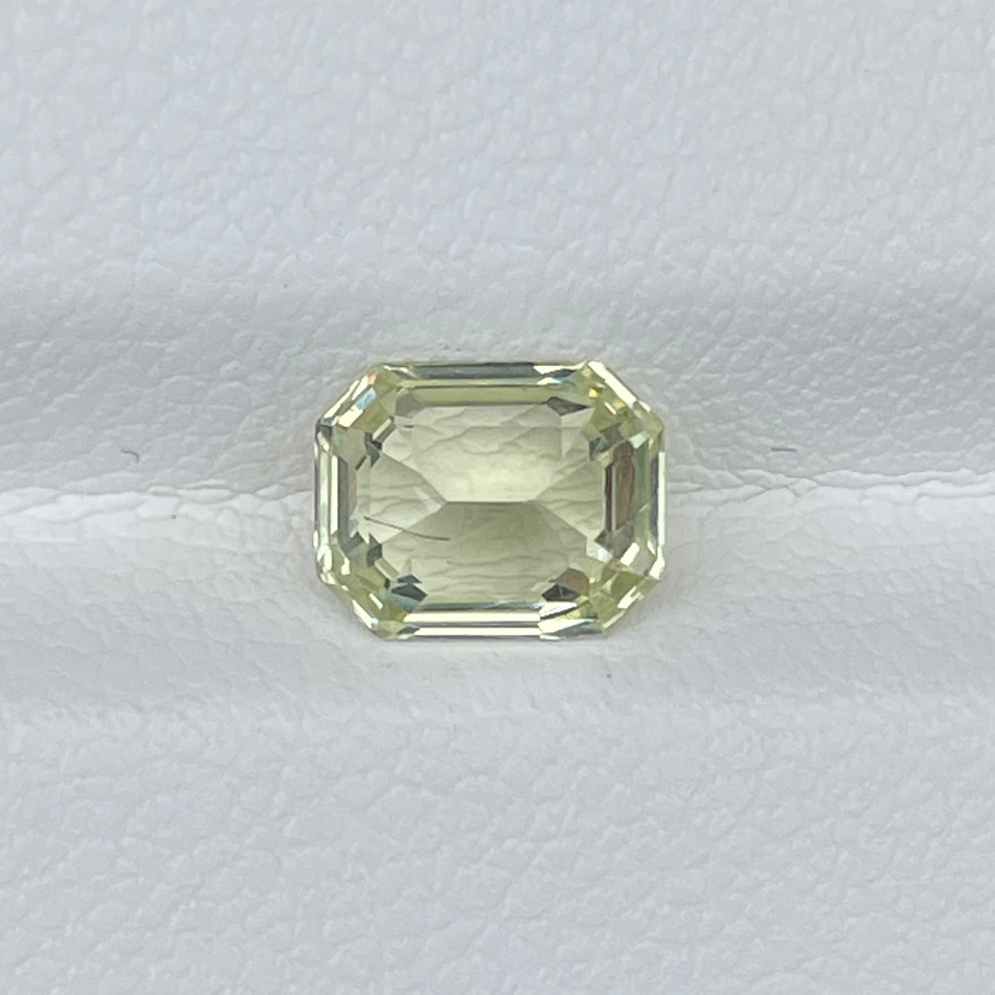 An elegant emerald-cut Yellow Chrysoberyl from Sri Lanka, displaying a bright yellow hue, eye-clean clarity, and sparkling luster.