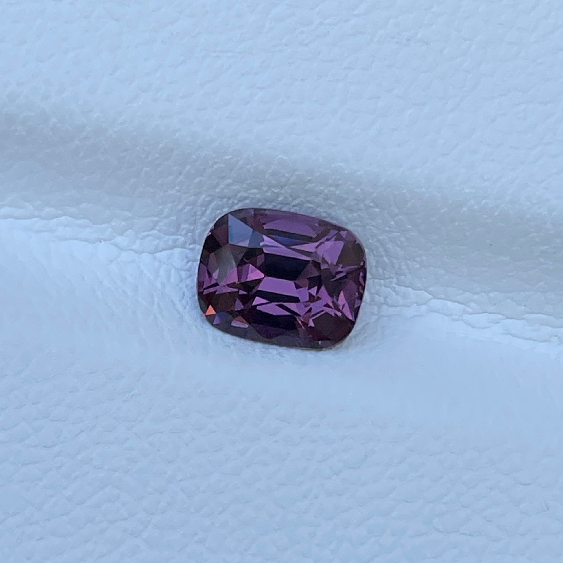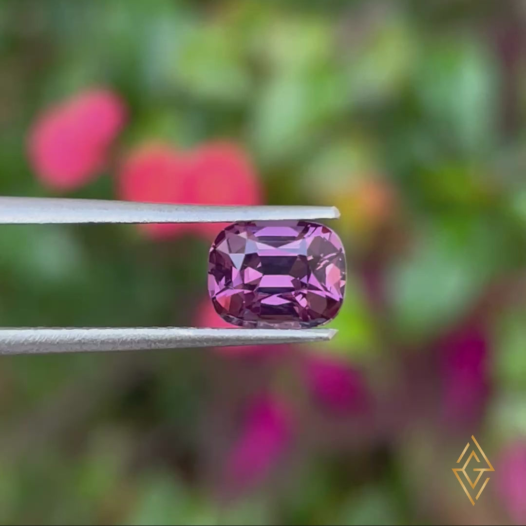 A cushion-cut Purplish Pink Spinel displaying clean clarity and a naturally appealing hue—an elegant choice for fine jewelry or a curated gemstone collection.